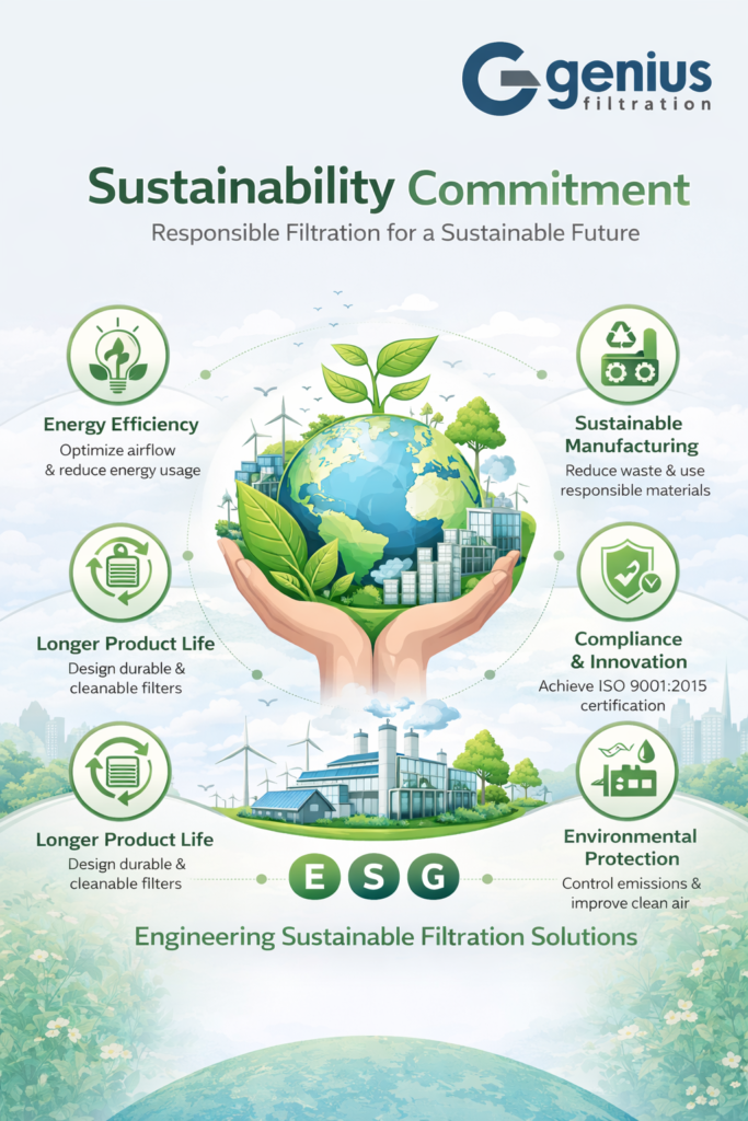 At Genius Filters and Systems Private Limited, sustainability is an integral part of our engineering philosophy and business strategy. We are committed to developing efficient, durable and environmentally responsible filtration solutions that support cleaner air, cleaner processes and reduced environmental impact across industries.
